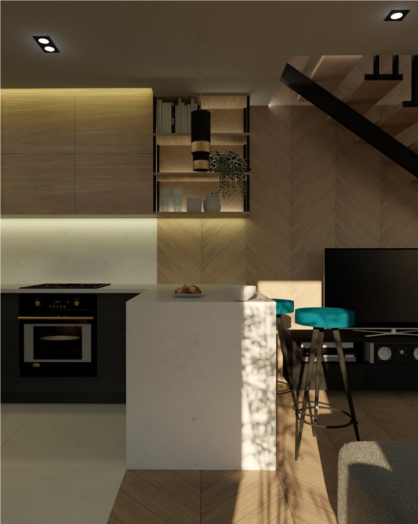 Celem było przedstawienie jednej z wielu możliwości funkcjonalnej aranżacji przestrzeni niewielkiego segmentu mieszkalnego. Zaproponowano aranżację dla trzech osób z kącikiem telewizyjnym i jadalnianym a w aneksie kuchennym zaproponowano układ mebli z półwyspem o funkcji blatu barowego. Propozycja wykończeń materiałowych i kolorystycznych zgodna z aktualnymi trendami. Schody w konstrukcji stalowej z balustradą w formie przepierzenia z płaskowników stalowych, stopnie schodów drewniane. Zróżnicowane oświetlenie wydobywa walory pomieszczenia oraz detale wykończenia ścian i podłogi i dzięki temu tworzy nastrój.