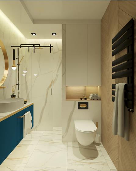 Układ funkcjonalny łazienki z wnęką gospodarczą na pralko-suszarkę dostępną ze strefy natrysku, zamykaną frontem szklanym mlecznym rozwieranym.