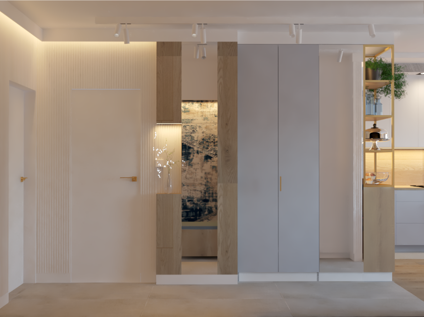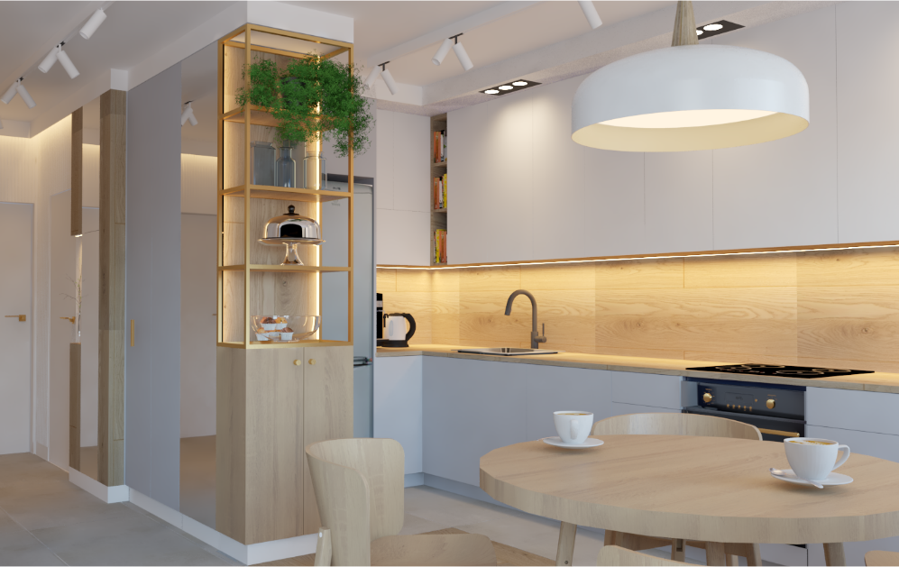 Mieszkanie trzypokojowe dla czterech osób. Celem było zwiększenie komfortu w strefie kuchni i zaprojektowanie nowej strefy dziennej, dostosowanie pokoju dzieci do potrzeb dwóch dorastających chłopców oraz zaprojektowanie bardziej komfortowej łazienki. Spośród kilku możliwych rozwiązań funkcjonalnych wybrany został projekt, który przewidywał rozebranie części ścian działowych z wielkiej płyty. Wykończenie kolorystyczne i materiałowe miało być jasne i spokojne.