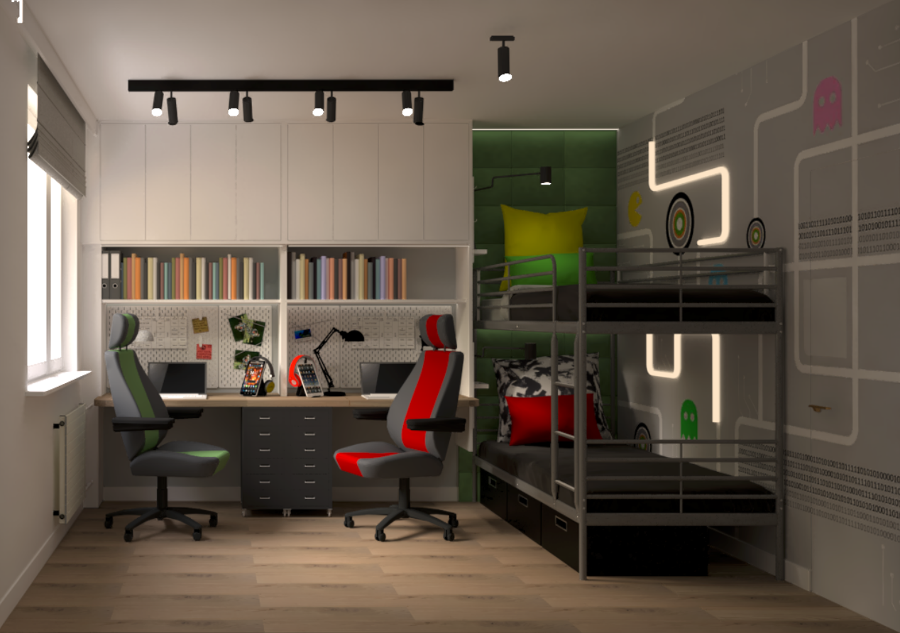 W pokoju chłopców powiększono strefę do nauki - zaprojektowano dwa wygodne biurka z miejscem do przechowywania, zapewniono dwa miejsca do spania własną strefę sypialną za pomocą piętrowego łóżka. jedną ze ścian wykończono tapetą, która może pokryć także tzw. drzwi ukryte. Naprzeciw biurek pozostanie istniejąca 3-częściowa szafa.